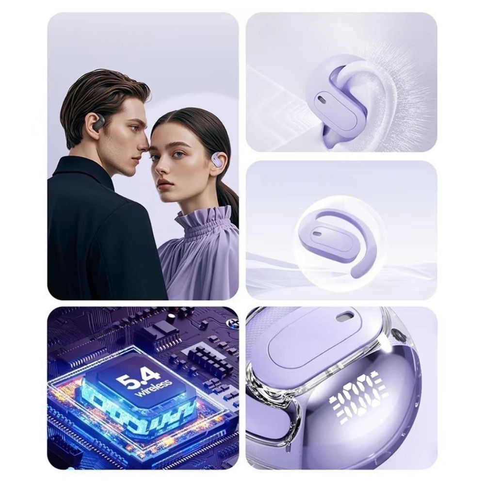 Su chip de audio Hi-Fi proporciona un sonido envolvente con bajos potentes, agudos definidos y voces nítidas, logrando un equilibrio perfecto para disfrutar cualquier tipo de contenido. El diseño tipo open-ear con gancho ergonómico se adapta cómodamente al oído, brindando estabilidad y confort durante horas, sin presión ni riesgo de caídas.